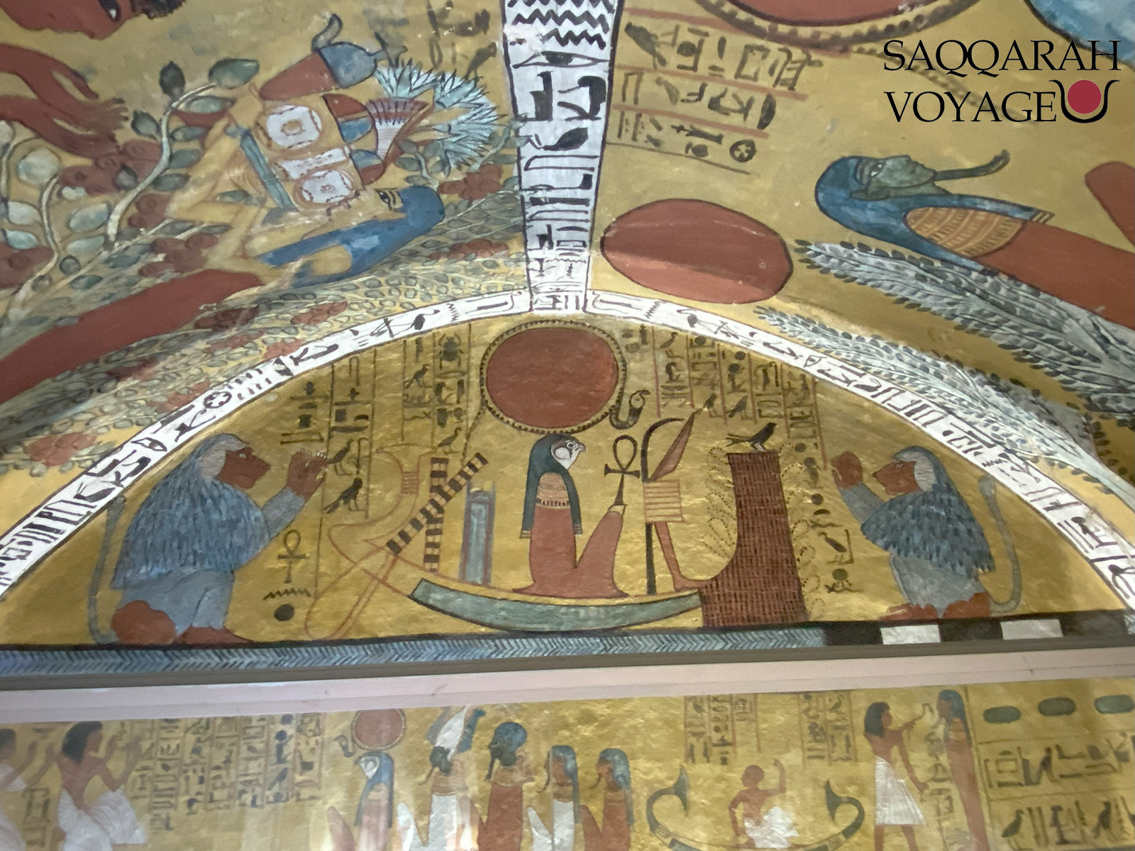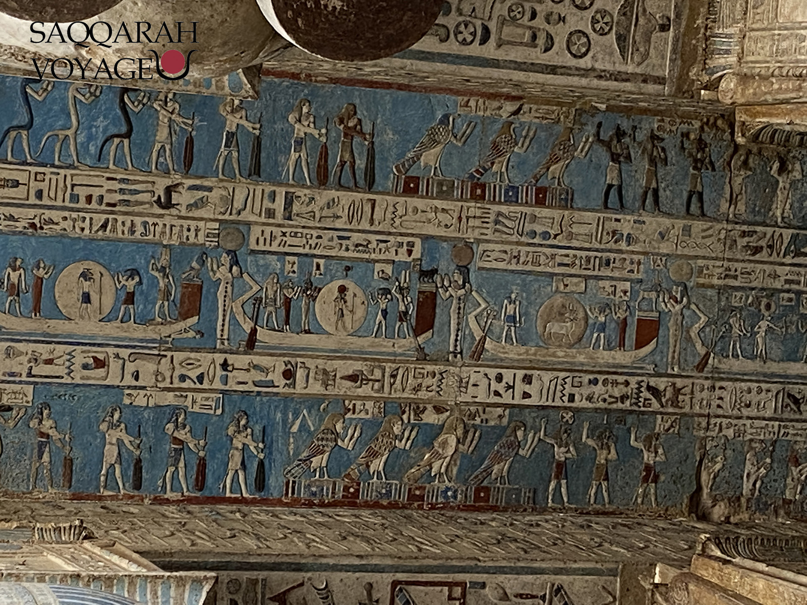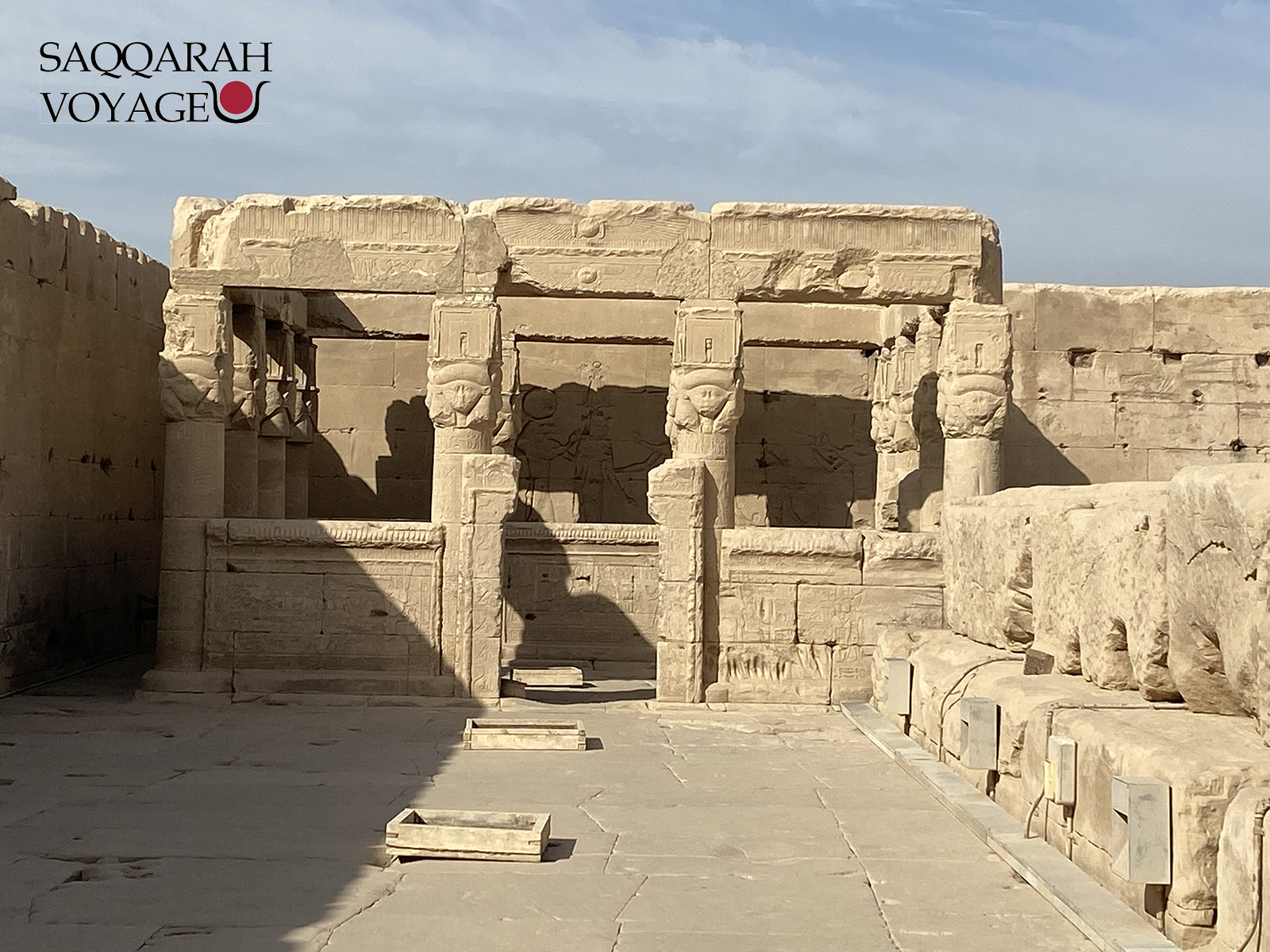 • Visite du temple de la déesse Hathor à Dendérah, la déesse de l’amour et des festivités, représentée sous les traits d’une vache sacrée ou d’une femme portant le disque solaire entre ses cornes.