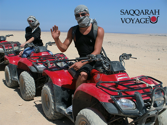 Saqqarah Voyage vous invite à vivre une aventure en quad unique au départ de Marsa Alam. Cette excursion quad à Marsa Alam est idéale pour tous ceux qui souhaitent découvrir le désert égyptien de façon ludique et dynamique. La plupart des visiteurs de Marsa Alam profitent de cette occasion pour conduire un quad à travers le désert, et si vous voulez tenter l’expérience, cette excursion est faite pour vous. Pour ce programme de trois heures, vous serez d’abord conduit à la station de quad, où l’on vous remettra votre quad et un casque, accompagné d’un briefing complet sur la sécurité. Ensuite, vous partirez à travers les dunes et paysages désertiques jusqu’au village bédouin, pour une immersion authentique dans la culture locale.