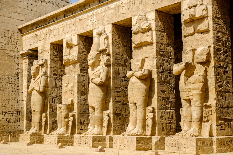 - Temple de Médinet Habou: Visite du temple de Médinet Habou, composé du temple du dieu Aon et du temple de Ramsès III avec d’immenses statues de Ramsès III représenté sous la forme d’Osiris et une grande salle à piliers.